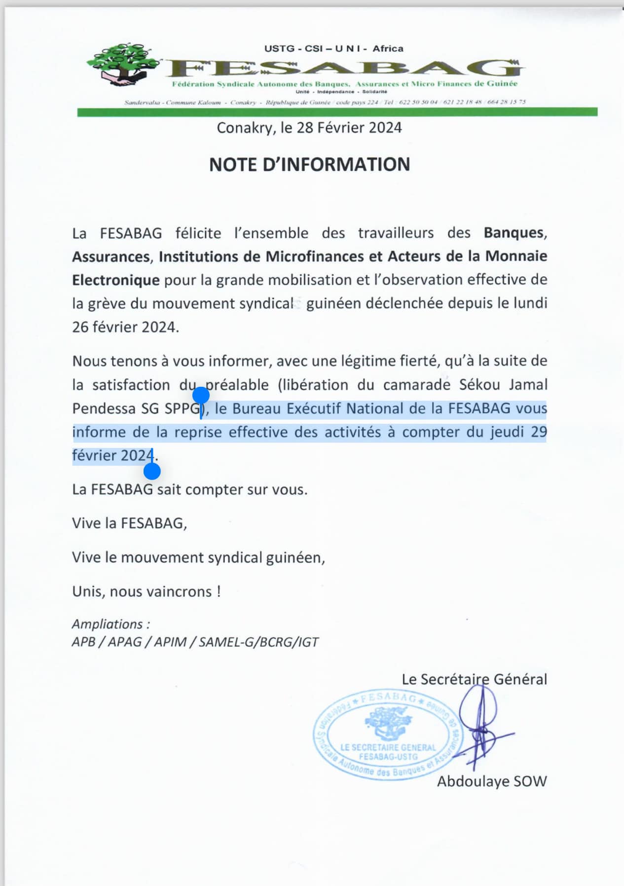 Dans un communiqué reçu par notre rédaction, le Bureau Exécutif National du sydicat des Banque en Guinée (FESABAG) a anoncé la reprise la reprise effective des activités bancaires à compter de demain jeudi 29 février 2024.