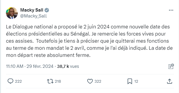 ” Le Dialogue national a proposé le 2 juin 2024 comme nouvelle date des élections présidentielles au Sénégal. Je remercie les forces vives pour ces assises. Toutefois je tiens à préciser que je quitterai mes fonctions au terme de mon mandat le 2 avril, comme je l’ai déjà indiqué. La date de mon départ reste absolument ferme.” A-t-il écrit