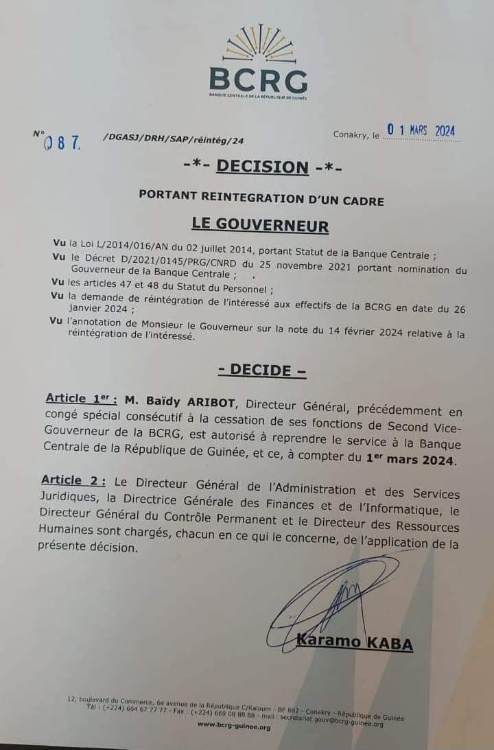Après plusieurs années d’absence au pays, monsieur Baidy Aribot, à travers une décision dont nous avons reçus copie, a été autorisé de revenir au pays et de reprendre son service à la Banque Centrale de la République de Guinée (BCRG).