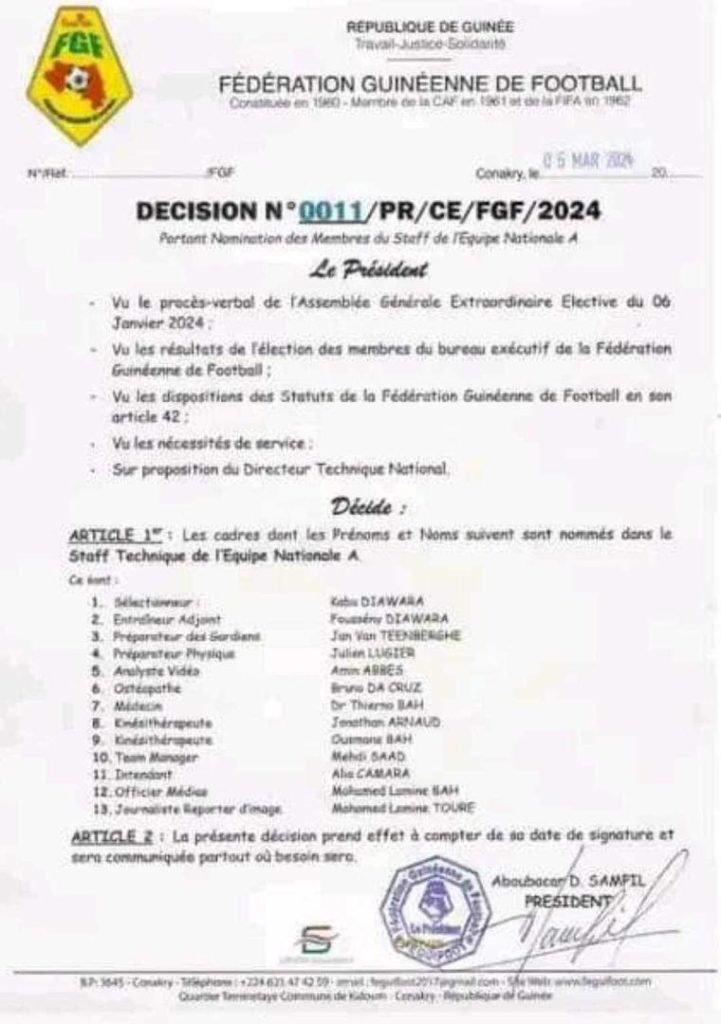 Pour le reste, Mehdi Saad est le team manager. Alia Camara devient le nouveau intendant. Les journalistes Mohamed Lamine Bah et Mohamed Lamine Touré sont respectivement officier médias et vidéaste de l’équipe selon le communiqué.