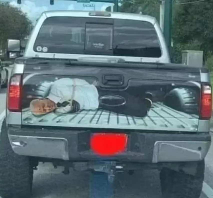 Sur le coffre du deuxième véhicule, un pick-up, apparaît une image montrant un Joe Biden pieds et mains liés.