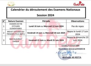 Guinée : le calendrier des examens nationaux session 2024 dévoilé par le MEPUA éducation Par Hassane Le 15 Avr, 2024 | 13 h 28 min Partager Le ministère de l’Enseignement Pré-Universitaire et de l’Alphabétisation a dévoilé ce lundi 15 avril 2024, le calendrier des examens nationaux, session 2024. Ci-dessous, le tableau : A lire aussi : Guinée : accord entre le gouvernement et le SLECG pour… 2 Déc, 2025 | 12 h 20 min Crise scolaire : le MEPU-A exhorte les écoles à maintenir… 30 Nov, 2025 | 21 h 11 min Post Views: 2 603 Partager :FacebookXJ’aime ça :J’aime chargement… Articles similaires Partager