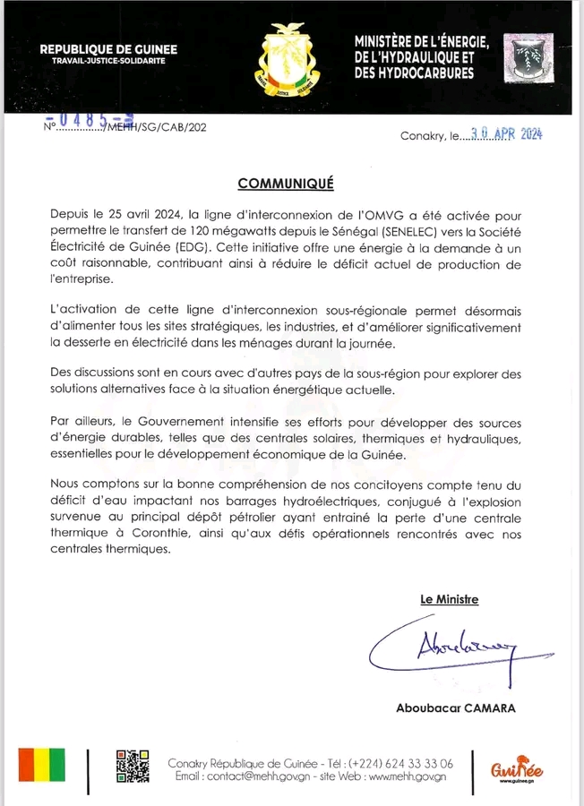 Dans un communiqué signé du ministre de l’énergie, de l’hydraulique et des hydrocarbures, il a été officialisé l’appui du Sénégal à la Guinée pour absorber la crise électrique en Guinée. Le ministre précise que “cette initiative offre une énergie à la demande à un coût raisonnable, contribuant ainsi à réduire le déficit actuel de production de l’entreprise“.