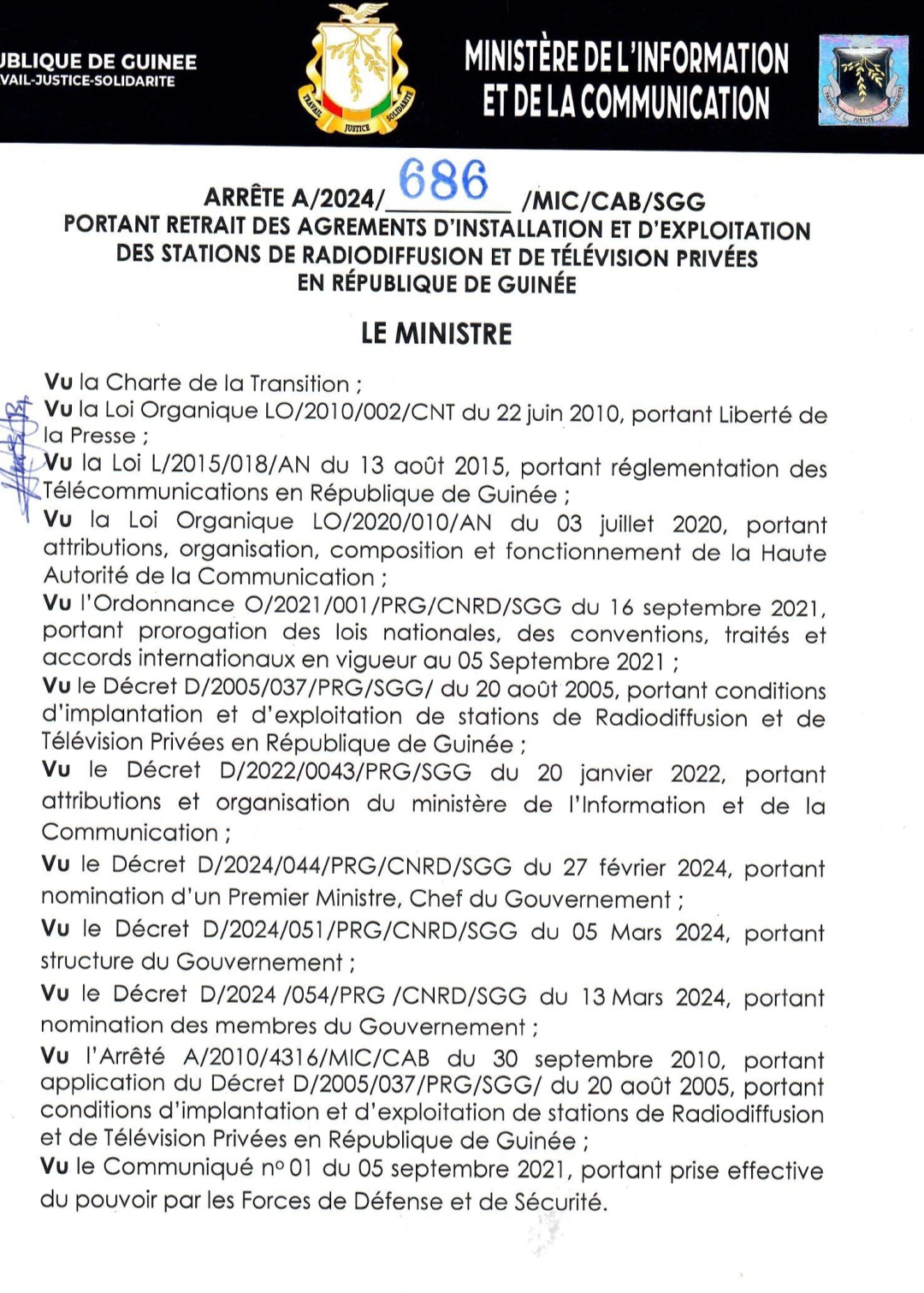 Comme nous l’avons précédemment annoncé, la junte au pouvoir en Guinée, a procédé ce mercredi 22 mai 2024 au retrait des agréments de FIM Fm, Hadafo Médias, Djoma Médias et Évasion.