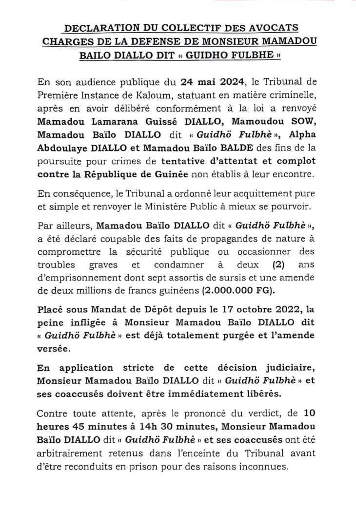 À travers une déclaration rendue publique à l’après-midi de ce vendredi, les avocats de Mamadou Baïlo Diallo alias Guidho Fulbhé et ces coaccusés, dénoncent la mise en détention de leurs clients en prison après leur acquittement par le tribunal, et exigent leur mise en liberté immediate.