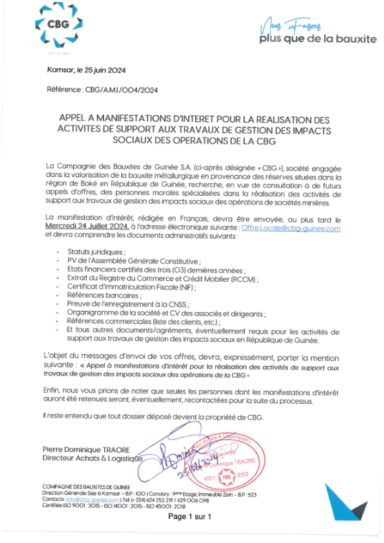 La Compagnie des Bauxites de Guinée S.A. (ci-après désignée « CBG »), société engagée dans la valorisation de la bauxite métallurgique en provenance des réserves situées dans la région de Boké en République de Guinée, recherche, en vue de consultation à de futurs appels d’offres, des personnes morales spécialisées dans la réalisation des activités de support aux travaux de gestion des impacts sociaux des opérations de sociétés minières.