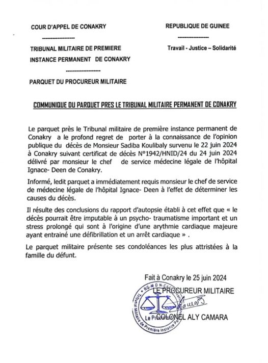 Le Communiqué du parquet près le Tribunal Miliataire Permanent de Conakry rélatif au décès de Sadiba Koulibaly société Par Frère Bah Le 26 Juin, 2024 | 11 h 51 min Partager Post Views: 1 724 A lire aussi : Guinée : la HAC lève la suspension de Kaback TV mais… 12 Déc, 2025 | 14 h 16 min Fin de suspension : l’UFDG relance ses activités en vue de… 11 Déc, 2025 | 10 h 30 min Partager :FacebookXJ’aime ça :J’aime chargement… Articles similaires Partager