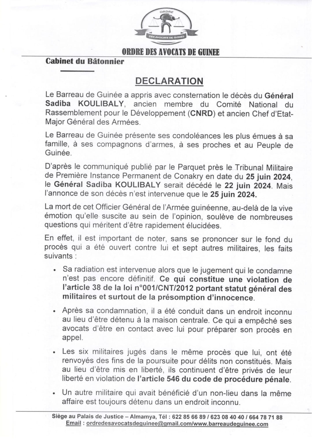Mort de Sadiba Koulibaly : Le Bareau de Guinée exige l’ouverture d’une enquête indépendante afin de déterminer les causes et les circonstances de sa mort de (Déclaration) DROIT & JUSTICE Par Hassane Le 27 Juin, 2024 | 13 h 57 min Partager Post Views: 882 A lire aussi : Désinformation en Guinée : le Parquet Général hausse le ton… 4 Déc, 2025 | 22 h 35 min Cellou Dalein Diallo contre l’État guinéen : ses avocats… 25 Nov, 2025 | 17 h 53 min Partager :FacebookXJ’aime ça :J’aime chargement… Articles similaires Partager
