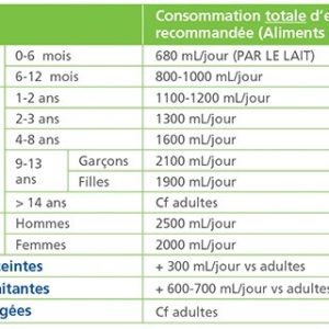 Sachant qu’un individu de taille moyenne perd chaque jour près de 1,5 litre d’eau par les urines et un autre litre par la sueur, les selles et la respiration, il est recommandé de boire entre 1 L et 1,5 L d’eau auxquels s’ajoute l’eau des aliments (fruits, légumes) qui correspond à environ 1 L d’eau par jour. Cette quantité d’eau varie selon l’endroit où l’on vit (dans les pays chauds, les besoins en eau sont plus élevés), si l’on pratique une activité physique, en cas d’allaitement ou en cas de maladie.