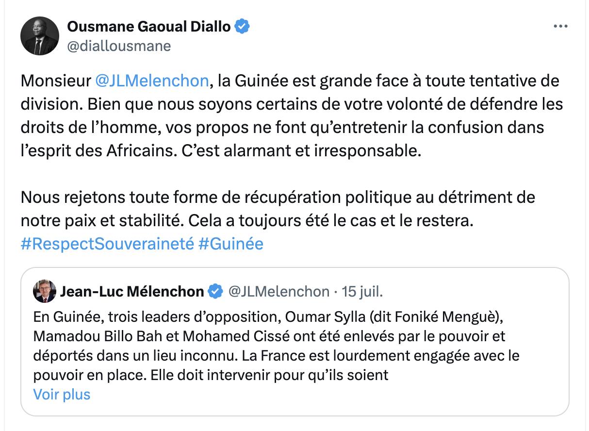” Monsieur @JLMelencho, la Guinée est grande face à toute tentative de division. Bien que nous soyons certains de votre volonté de défendre les droits de l’homme, vos propos ne font qu’entretenir la confusion dans l’esprit des Africains. C’est alarmant et irresponsable. Nous rejetons toute forme de récupération politique au détriment de notre paix et stabilité. Cela a toujours été le cas et le restera.