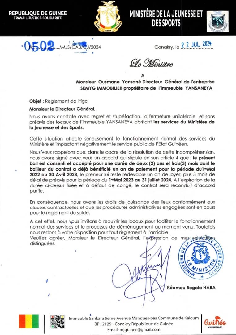 Le ministre de la jeunesse et des sports invite le bailleur au respect de l’accord de bail en son article 4″ le présent bail est consenti et accepté pour une durée de deux(2) ans et trois (3)mois dont le bailleur du contrat a déjà bénéficié un an de paiement pour la période du 1 mai 2022 au 30 avril 2023” et conformément aux clauses contractuelles nous avons les droits de jouissances des lieux.