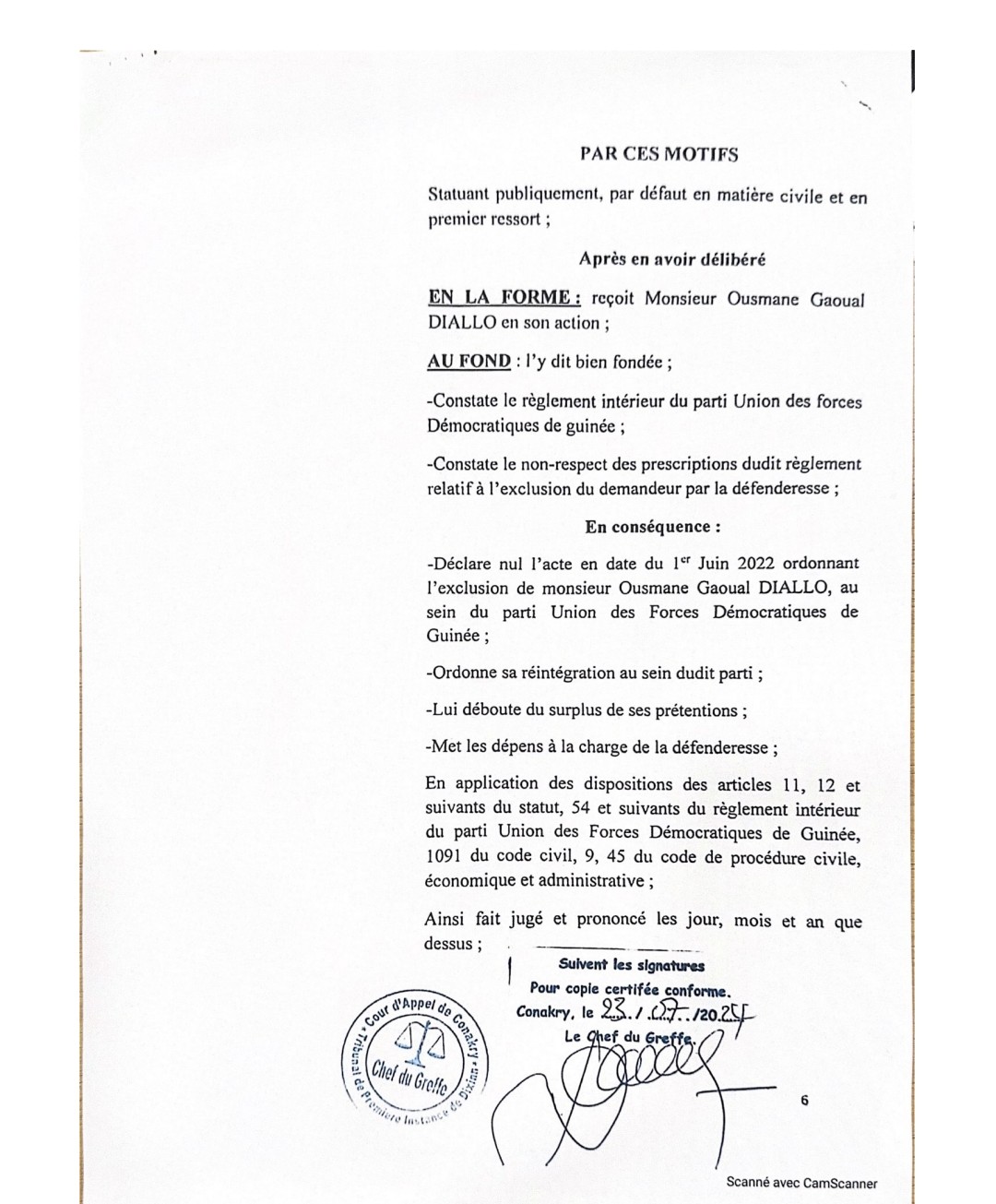 Tout cela « en application des dispositions des articles 11, 12 et suivants du statut, 54 et suivants du règlement intérieur du parti Union des Forces Démocratiques de Guinée, 1091 du code civil, 9, 45 du code de procédure civile, économique et administrative »