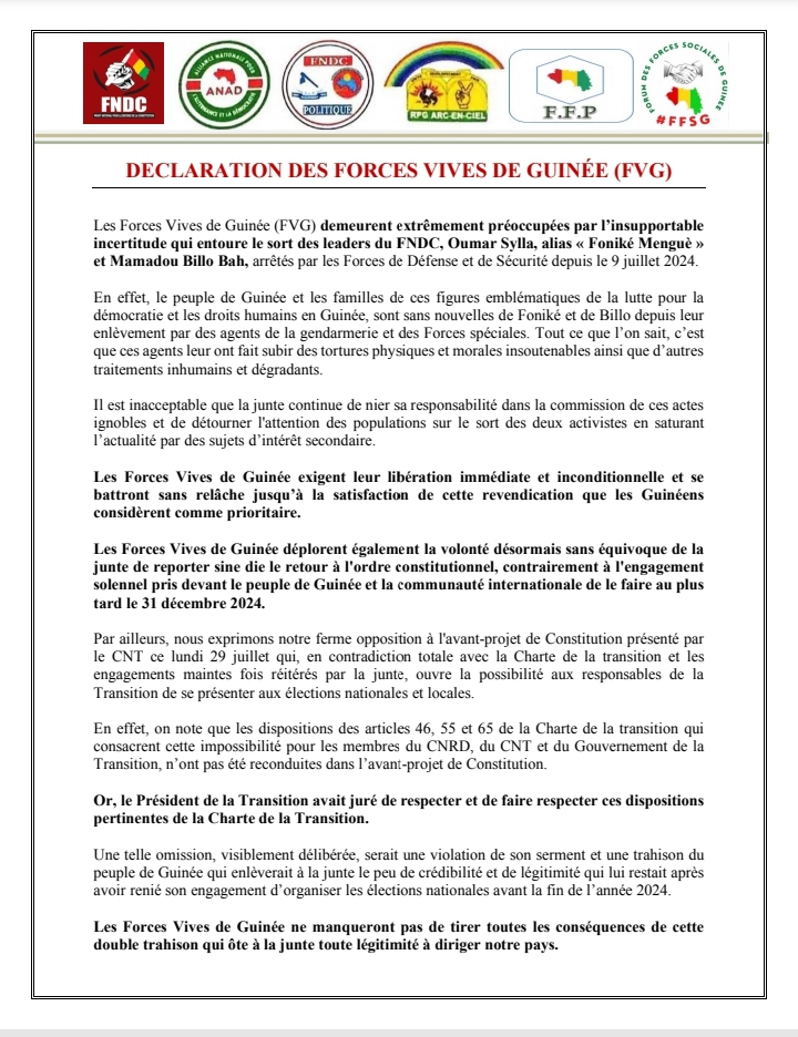 Comme il fallait s’y attendre, l’avant-projet de la nouvelle constitution Guinéenne, a été rejetté par le Forces Vives de Guinée, qui ont exprimées selon eux leur opposition, car disent-elles, cet avant projet est en contradiction totale avec la Charte de la transition et les engagements du présient du CNRD, président de la transition, mainte fois réitérés.