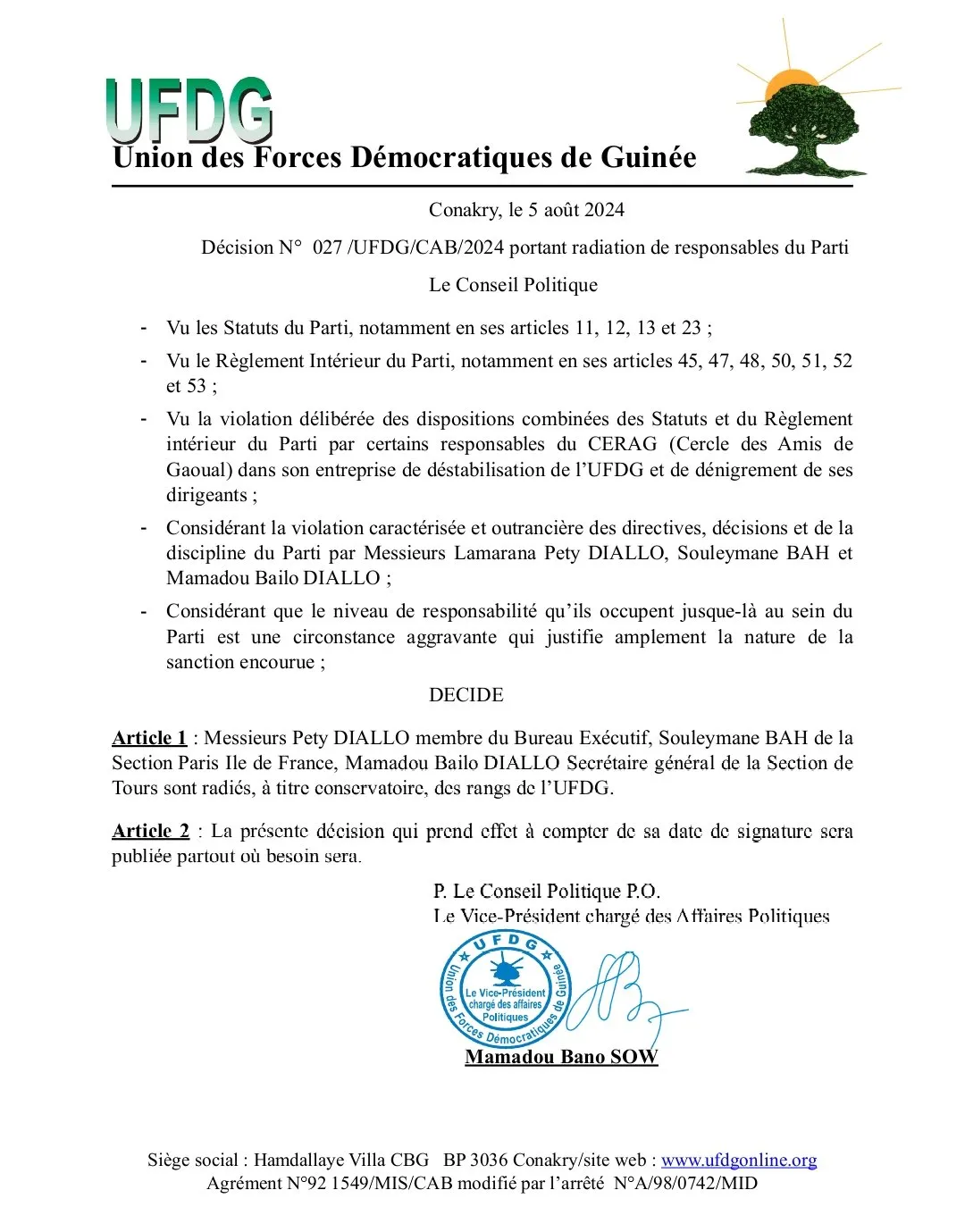 Dans une décision signée de monsieur Mamadou Bano Sow, vice-président chargé des Affaires politiques, au nom du conseil politique de l’UFDG, les membres dont les noms suivent sont radiés du parti.