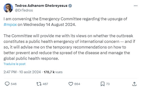 Le comité d’urgence de l’Organisation mondiale de la santé (OMS) se réunira ce mercredi 14 août 2024, a annoncé ce samedi 10 août 2024 le directeur général de ladite organisation, Tedros Ghebreyesus, dans un post sur “X”.