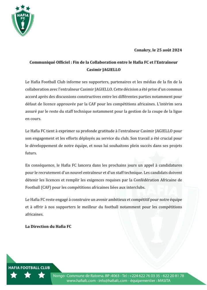 « Le Hafia Football Club informe ses supporters, partenaires et les médias de la fin de la collaboration avec l’entraîneur Casimir JAGIELLO. Cette décision a été prise d’un commun accord après des discussions constructives entre les différentes parties notamment pour défaut de licence approuvée par la CAF pour les compétitions africaines »