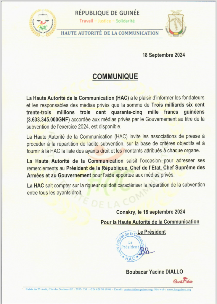Médias: la HAC annonce la disponibilité de la subvention pour l’exercice 2024 société Par Frère Bah Le 18 Sep, 2024 | 12 h 28 min Partager Post Views: 1 018 A lire aussi : Départ à haut risque : des Guinéens empruntent une nouvelle… 5 Déc, 2025 | 15 h 42 min Mobilisation nationale pour l’assainissement : le… 5 Déc, 2025 | 13 h 47 min Partager :FacebookXJ’aime ça :J’aime chargement… Articles similaires Partager