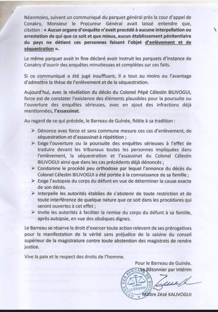 Mort tragique de Colonel Célestin Bilivogui : le Barreau de Guinée exige des enquêtes et une autopsie sur le corps (déclaration)