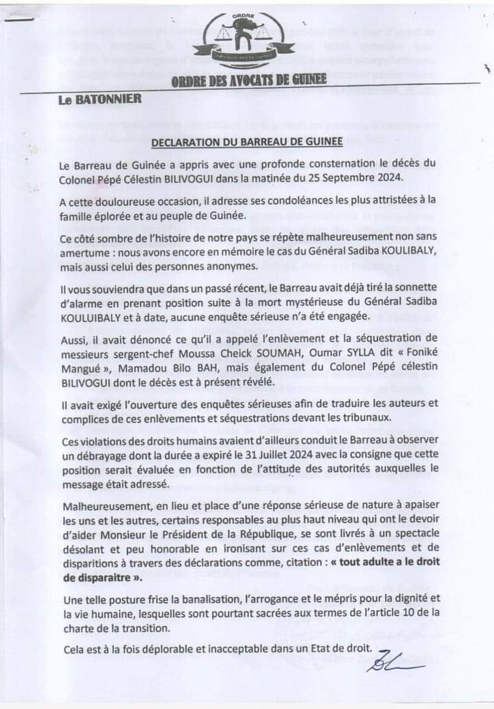 Mort tragique de Colonel Célestin Bilivogui : le Barreau de Guinée exige des enquêtes et une autopsie sur le corps (déclaration)