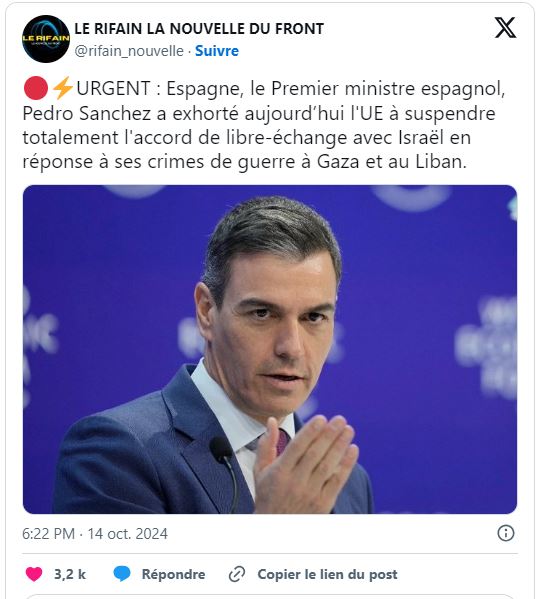 Le Premier ministre espagnol, Pedro Sánchez, demande à l’Union européenne de suspendre l’accord de libre-échange avec Israël, en raison des offensives militaires en cours dans la bande de Gaza et au Liban.