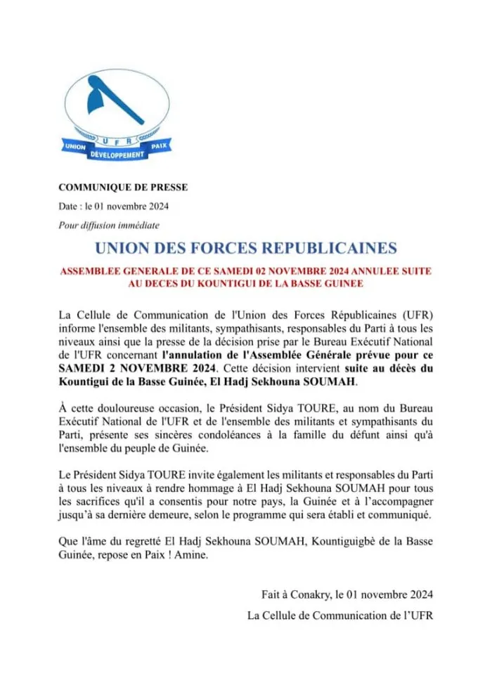 décès d’Elhadj Sekhouna : l’UFR annule son Assemblée Générale hebdomadaire (Communiqué) Politiquesociété Par Hassane Le 2 Nov, 2024 | 2 h 13 min Partager Post Views: 1 192 A lire aussi : Guinée : Cellou Dalein sonne l’alarme : “La démocratie… 6 Déc, 2025 | 23 h 35 min Présidentielle en Guinée : l’appel de Yéro Baldé… ignoré par… 6 Déc, 2025 | 9 h 51 min Partager :FacebookXJ’aime ça :J’aime chargement… Articles similaires Partager