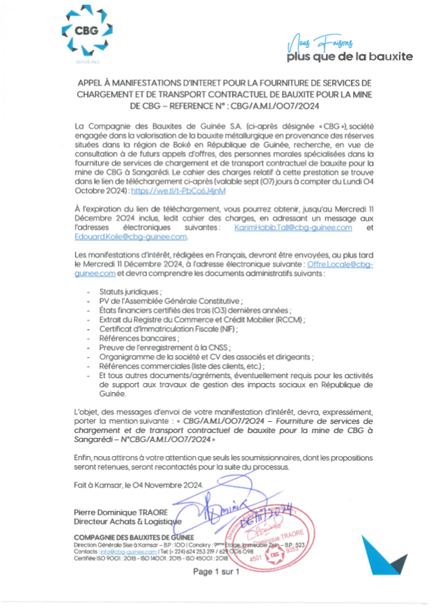 La Compagnie des Bauxites de Guinée SA. (ci-après désignée « CBG société engagée dans la valorisation de fa bauxite métallurgique en provenance des réserves situées dans la région de Boké en République de Guinée, recherche, en vue de consultation d de futurs appels d’offres, des personnes morales spécialisées dans la fourniture de services de chargement et de transport contractuel de bauxite pour la mine de CBG à Sangarédi.