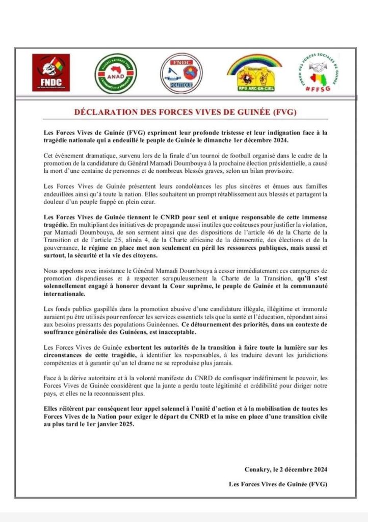 Suite au drame survenu à N’Zérékoré à l’occasion de la finale du tournoi doté, du Général Président de la transition Guinéenne, les Forces vives de Guinée déclarent leur tristesse et tiennent pour responsables le CNRD et son président.