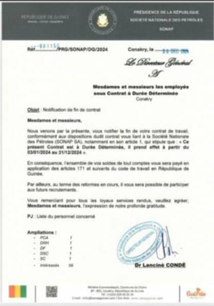 Dans un courrier que nous avons reçus, Dr Lancié Condé, directeur Général de la Société Nationale des Pétrole (SONAP) a remercié 56 contractuels en cette fin d’année.
