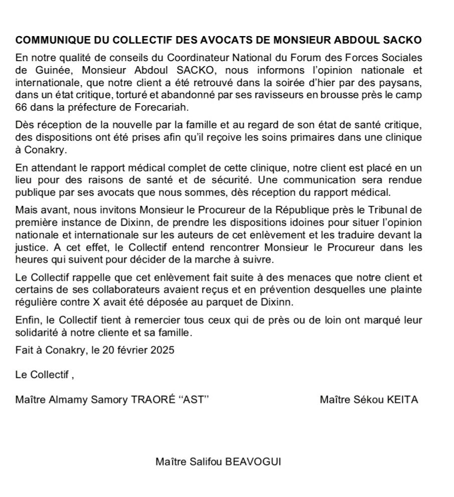 ” Nous informons l’opinion nationale et internationale, que notre client a été retrouvé dans la soirée d’hier par des paysans, dans un état critique, torturé et abandonné par ses ravisseurs en brousse près le camp 66 dans la préfecture de Forécariah“.