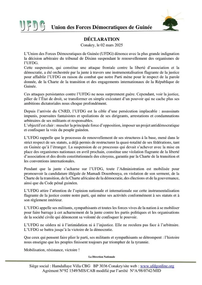 Audience accordée par le Président Mamadi Doumbouya à des cadres de l’UFDG le parti fait une mise au point importante.