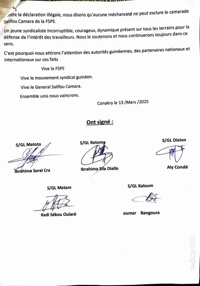 Dans une déclaration rendue publique ce jeudi 13 mars 2025, les secrétaires généraux des sections communales de la Fédération syndicale professionnelle de l’éducation (FSPE) de Conakry après avoir publiquement contesté l’exclusion de Salifou Camara des instances de la Confédération nationale des travailleurs de Guinée (CNTG), ont démandés le départ pure et simple d’Amadou Diallo à la tête de la CNTG.