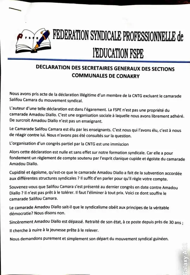Conakry – Les sécrétaires Généraux sections communales de la FSPE démandent le départ d’Amadou Diallo à la tête de la CNTG (Déclaration)