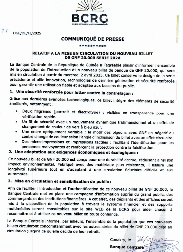 La Banque Centrale de la République de Guinée (BCRG), a l’agréable plaisir d’informer l’ensemble de la population de l’introduction d’un nouveau billet de banque de GNF20.000, qui sera mis en circulation à partir du mercredi 2 avril 2025. Ce billet conserve le design de la série précédente et allie innovation, technologies de dernière génération et sécurité renforcée pour garantir une utilisation fiable et adaptée aux besoins du public.