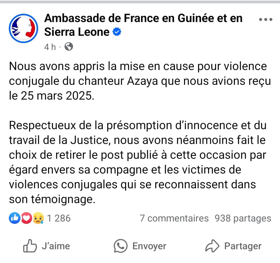 ” Nous avons appris la mise en cause pour violence conjugale du chanteur Azaya que nous avions reçu le 25 mars 2025. Respectueux de la présomption d’innocence et du travail de la Justice, nous avons néanmoins fait le choix de retirer le post publié à cette occasion par égard envers sa compagne et les victimes de violences conjugales qui se reconnaissent dans son témoignage”, a réagit l’ambassade de France.