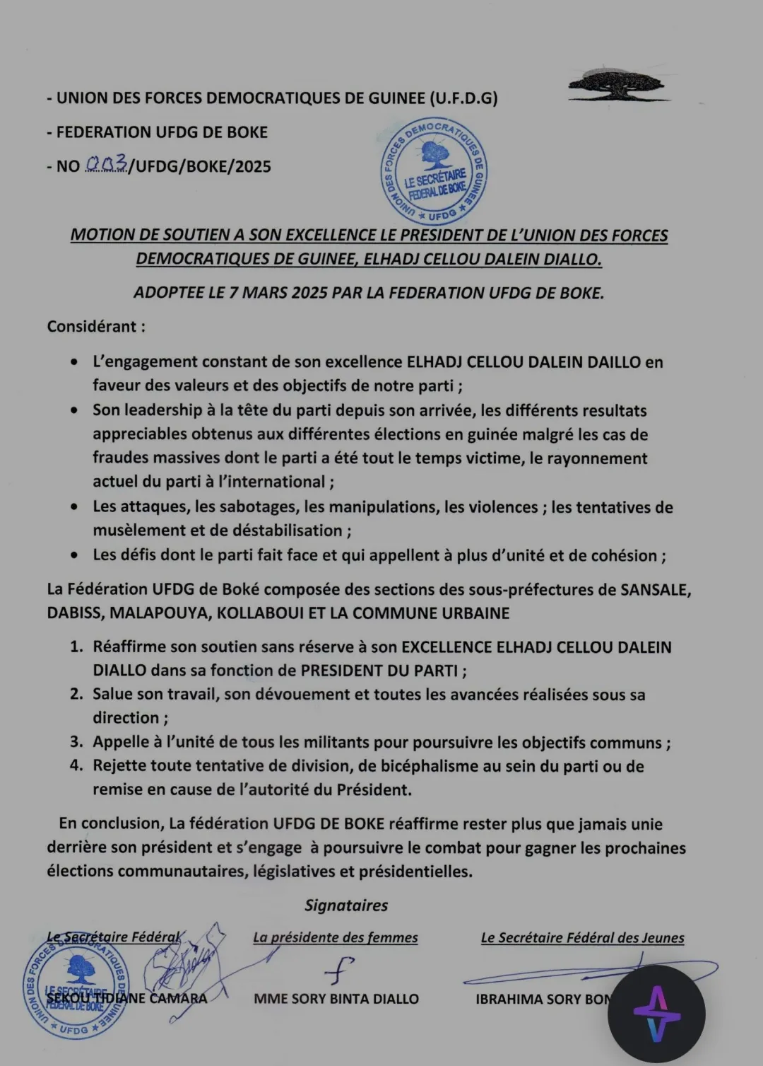 A près certaines de l’intérieur du pays et du Grand Conakry, la fédération de Boké réitère son attachement aux idéaux du parti et de son président, Elhadj Cellou Dalein Diallo.