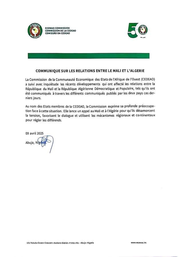 Dans un communiqué rendu public, la Communauté économique des Etats de l’Afrique de l’ouest (CEDEAO) a réagi aux récentes tensions entre le Mali et l’Algérie, appelant les deux parties au dialogue et à utiliser “les mécanismes régionaux et continentaux pour régler leurs différends”