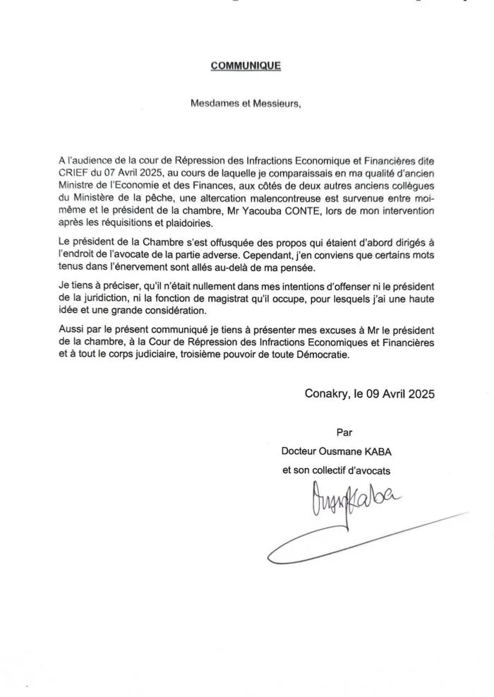 Dans un communiqué transmis à notre rédaction, Dr Ousmane Kaba, président du parti PADES présente ses excuses officielles au juge Yacouba Conté, après ses propos tenus à l’endroit de celui-ci à l’audience de la cour de Répression des Infractions Economique et Fonancières (CRIEF), au cours de laquelle il comparaissait en sa qualité d’ancien ministre de l’Economie et des Finances.