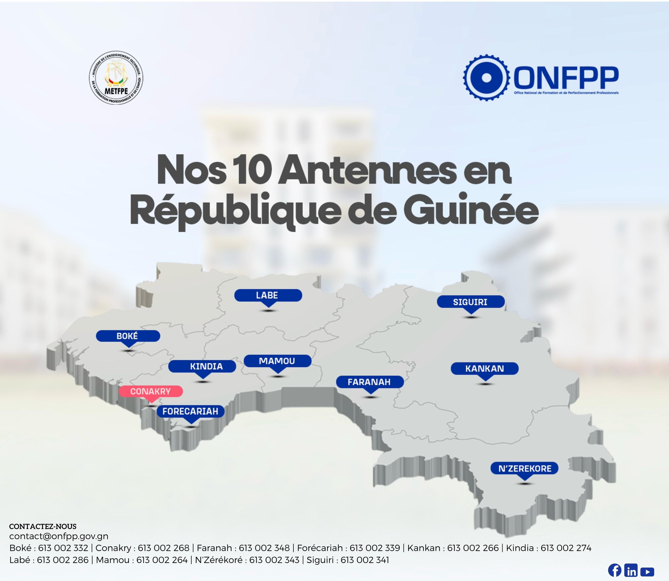 Créé le 22 avril 1986 et placé sous la tutelle du Ministère en charge de l’Enseignement Technique de la Formation Professionnelle et de l’Emploi, l’Office National de Formation et de Perfectionnement Professionnels – ONFPP, est un établissement public à caractère administratif qui a réussi, à travers différents régimes et différents managers à sa tête, à construire une dynamique de refondation de l’Etat et se positionner au centre des besoins et des défis pour une Guinée forte et prospère à travers la mise en œuvre de la politique du gouvernement guinéen en matière de formation continue du personnel des entreprises et du perfectionnement dans le secteur informel.