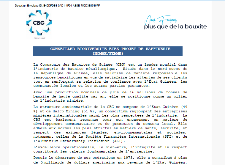 La Compagnie des Bauxites de Guinée (CBG) est un leader mondial dans l’industrie de bauxite métallurgique. Située dans le nord-ouest de la République de Guinée, elle valorise de manière responsable les ressources bauxitiques en vue de satisfaire les attentes de ses clients tout en renforçant sa relation de confiance avec l’État Guinéen, les communautés locales et les autres parties prenantes.
