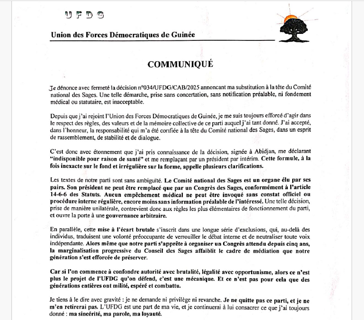 ” Je dénonce avec fermeté la décision n°034/UFDG/CAB/2025 annonçant ma substitution à la tête du Comité national des Sages. Une telle démarche, prise sans concertation, sans notification préalable, ni fondement médical ou sanitaire, est inacceptable.