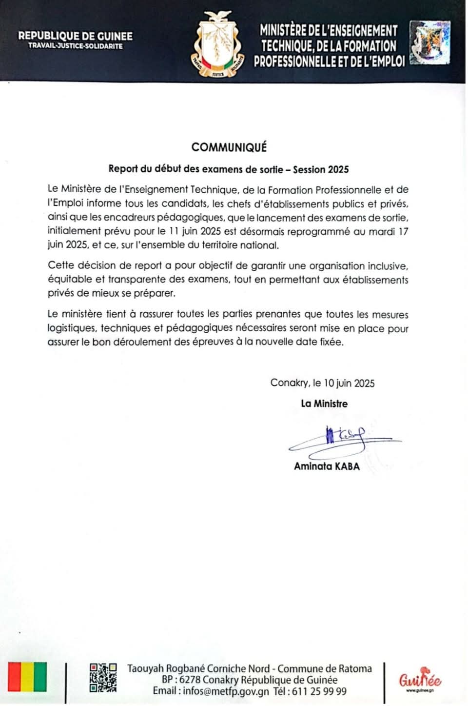 Initialement prévu ce mercredi 11 juin 2025, le Ministère de l’Enseignement Technique, de la Formation Professionnelle et de l’Emploi annonce à travers un communiqué rendu public ce mardi 10 juin 2025, que le lancement des examens de sortie est désormais reporté au mardi 17 juin 2025, et ce, sur l’ensemble du territoire national.