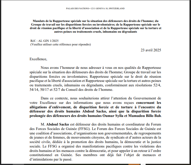 Ce qui suit est basé sur une communication écrite par la Rapporteuse spéciale sur la situation des défenseurs et défenseuses des droits humains et d’autres experts des Nations Unies et transmise au Gouvernement de la Guinée le 23 avril 2025. La communication est restée confidentielle durant 60 jours afin de permettre au Gouvernement de répondre. Malheureusement, le Gouvernement n’a pas répondu dans ce délai. Si une réponse est reçue, elle sera publiée dans la base de données des procédures spéciales des Nations Unies.