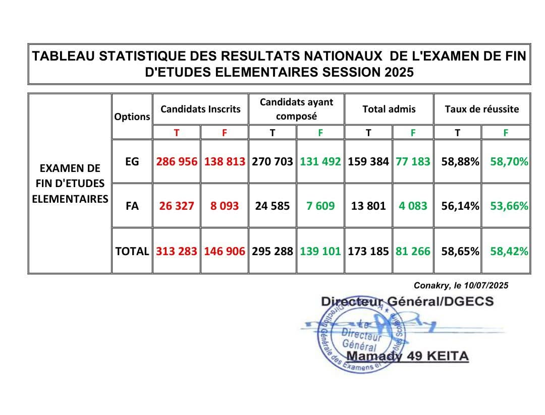 Conakry- Ce jeudi 10 juillet 2025, le Ministère de l’enseignement pré-universitaire et de l’alphabétisation (MEPU-A) a publié, le tableau statistique des résultats nationaux de l’examen de fin d’Etudes Elémentaires (CEE).