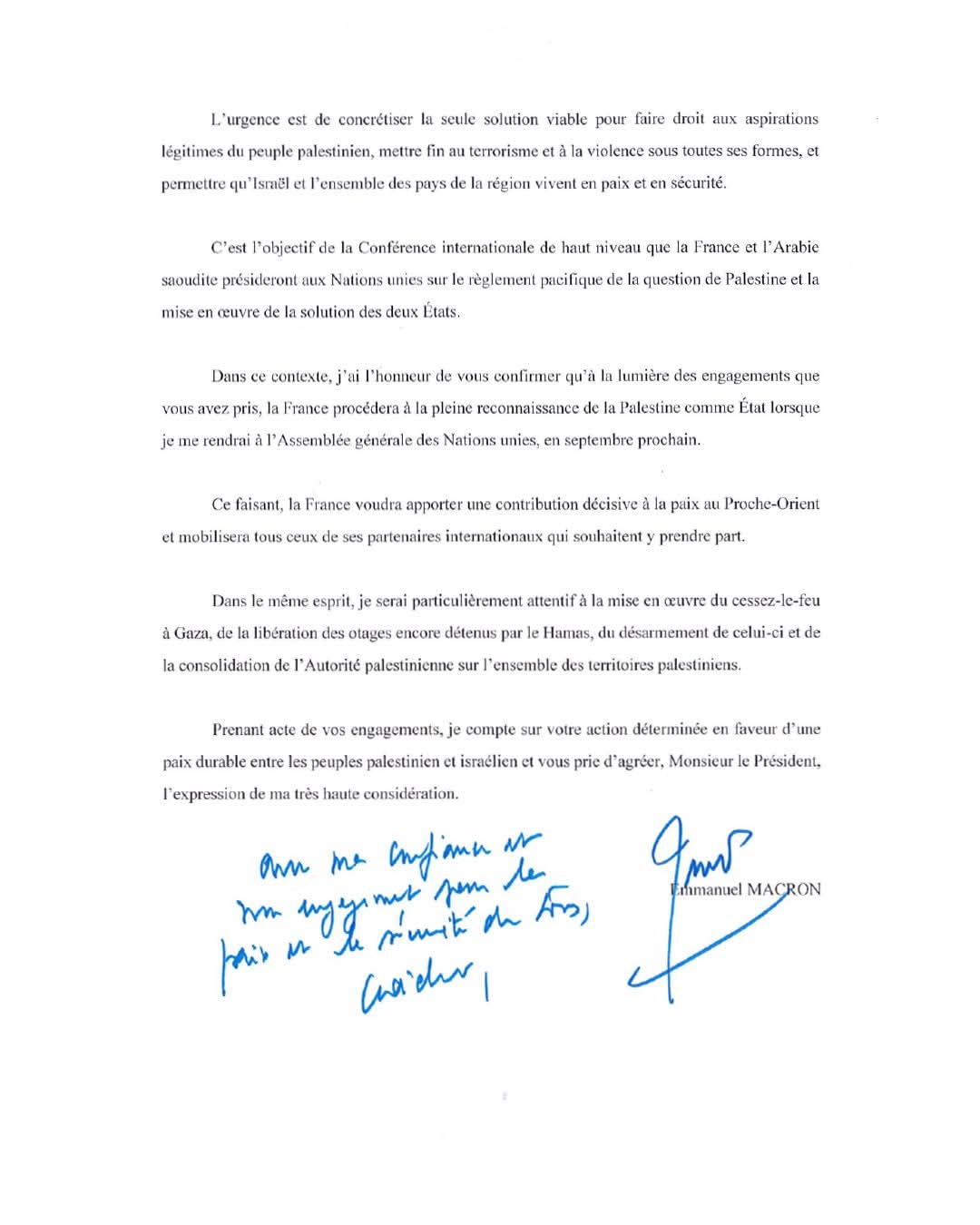 À la lumière des engagements que le président de l’Autorité palestinienne a pris auprès de moi, je lui ai donc écrit ma détermination à avancer.