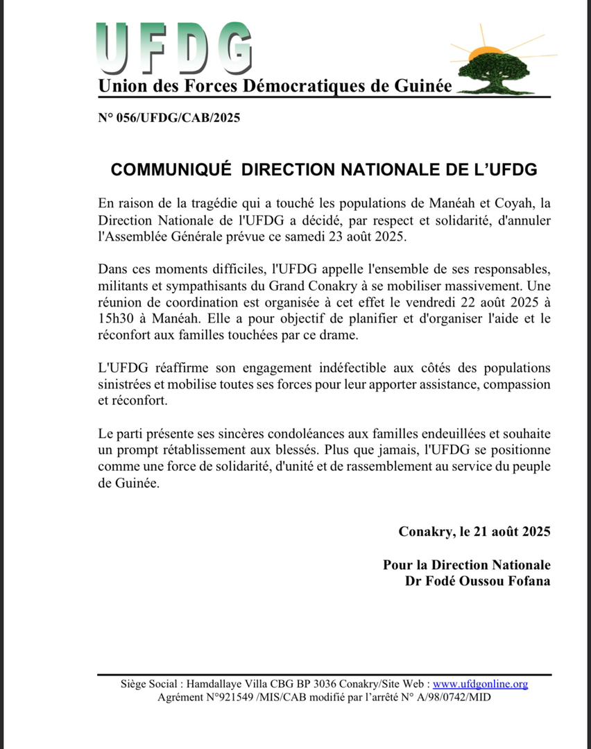 ” Dans ces moments difficiles, l’UFDG appelle l’ensemble de ses responsables, militants et sympathisants du Grand Conakry à se mobiliser massivement. Une réunion de coordination est organisée à cet effet le vendredi 22 août 2025 à 15h30 à Manéah. Elle a pour objectif de planifier et d’organiser l’aide et le réconfort aux familles touchées par ce drame...”