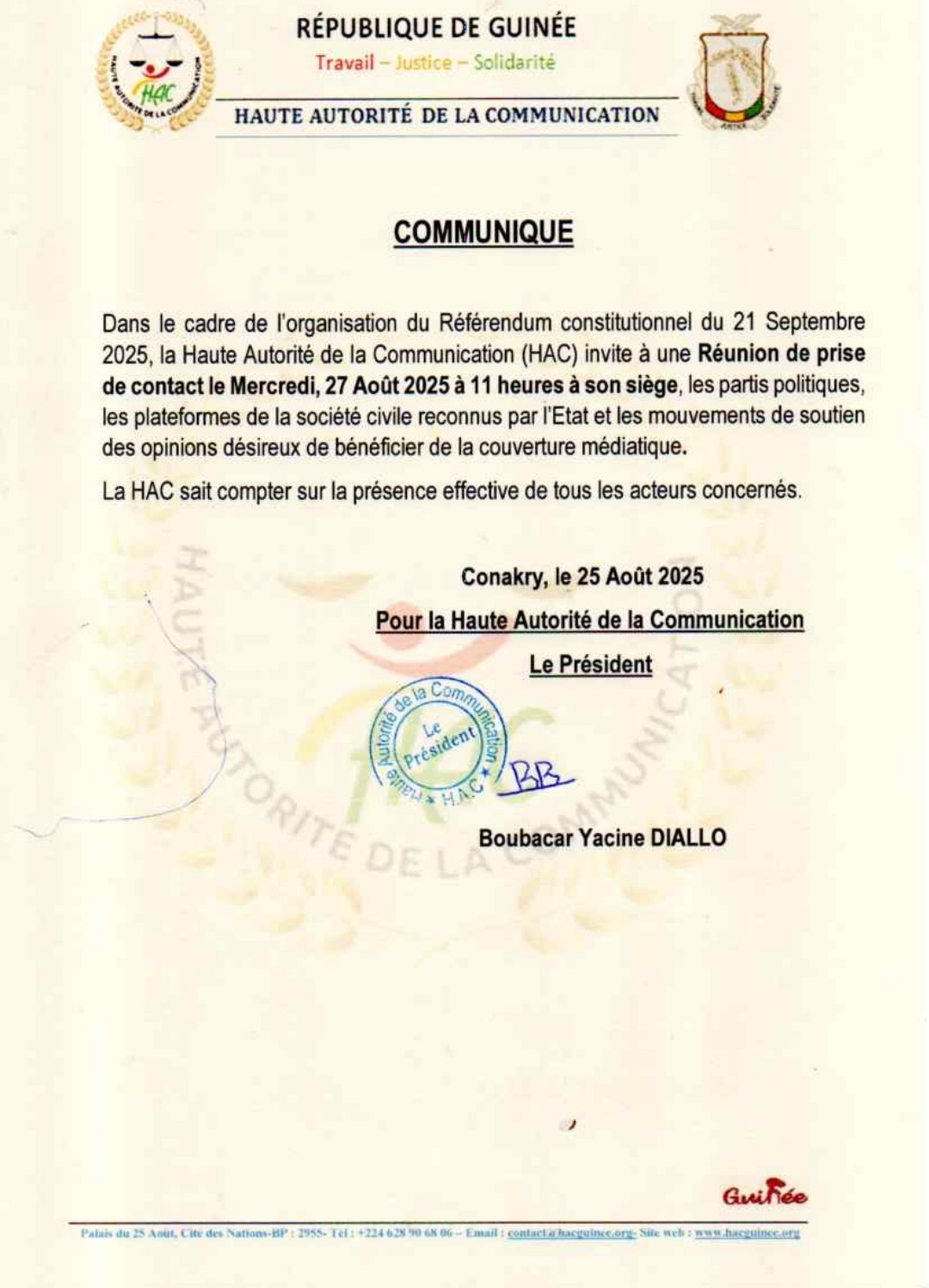 Dans un communiqué rendu public ce lundi 25 août 2025, la Haute Autorité de la Communication (HAC) a annoncé la tenue d’une rencontre de prise de contact avec partis politiques et acteurs de la société civile dans le cadre de l’organisation du Référendum constitutionnel prévu le 21 septembre prochain.