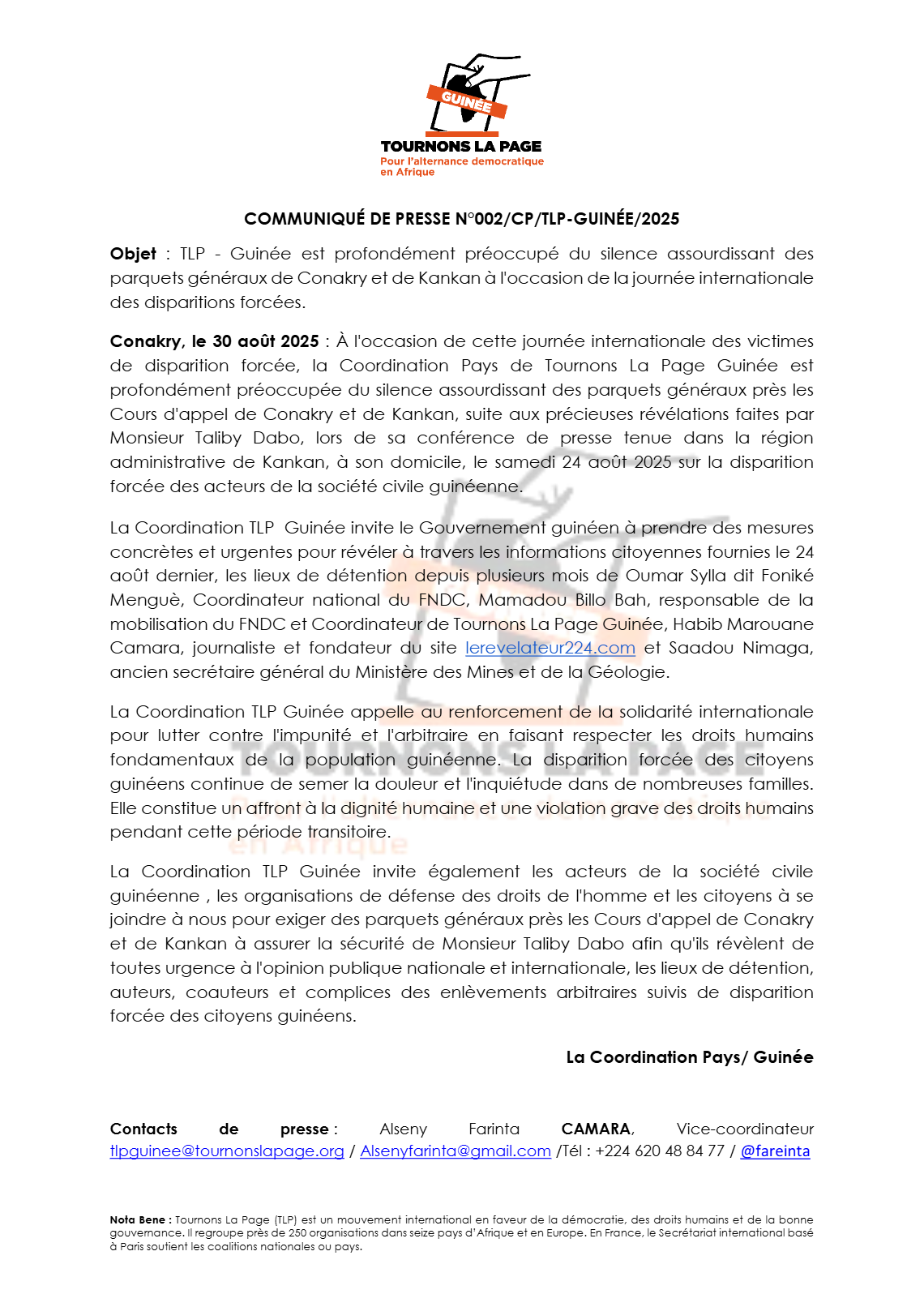 A L’occasion de la journée Internationale des victimes de disparition forcée, la Coordination Pays de Tournons La Page Guinée (TLP), a affichée sa préoccupation face au silence des parquets généraux près les Cours d’appel de Conakry et de Kankan, après révélations faites par Monsieur Taliby Dabo, lors de sa conférence de presse tenue à son domicile à Kankan, le samedi 24 août 2025 sur la disparition d’Oumar Sylla et Cie, et lancée une invite à l’endroit des autorités Guinéennes, à prendre des mesures concrètes et urgentes pa rapoort à ce sujet