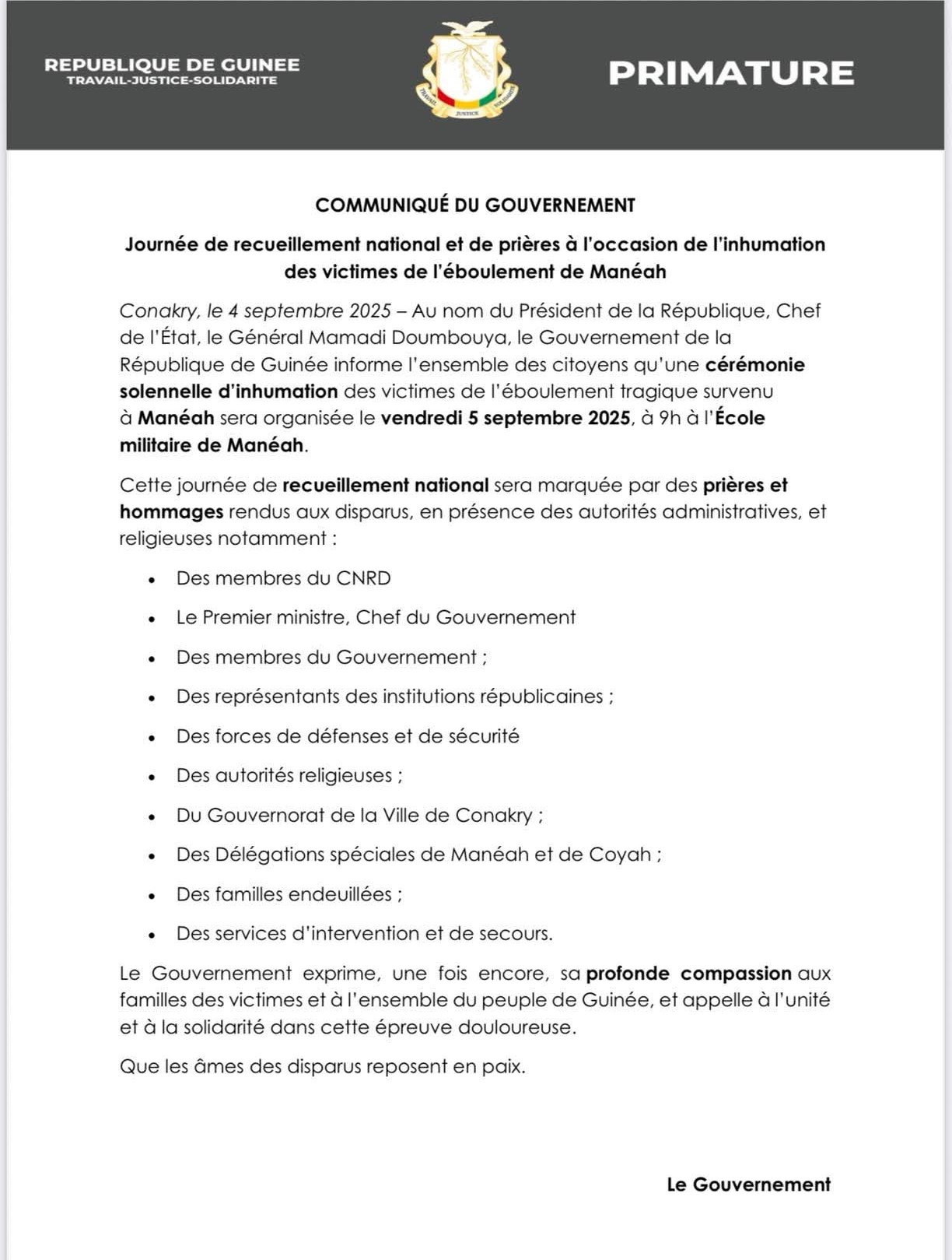 Dans un communiqué officiel publié ce jeudi 4 septembre, le Gouvernement guinéen a annoncé que la cérémonie d’inhumation des victimes du glissement de terrain survenu à Manéah se tiendra ce vendredi 5 septembre à 9h, dans l’enceinte de l’École militaire.