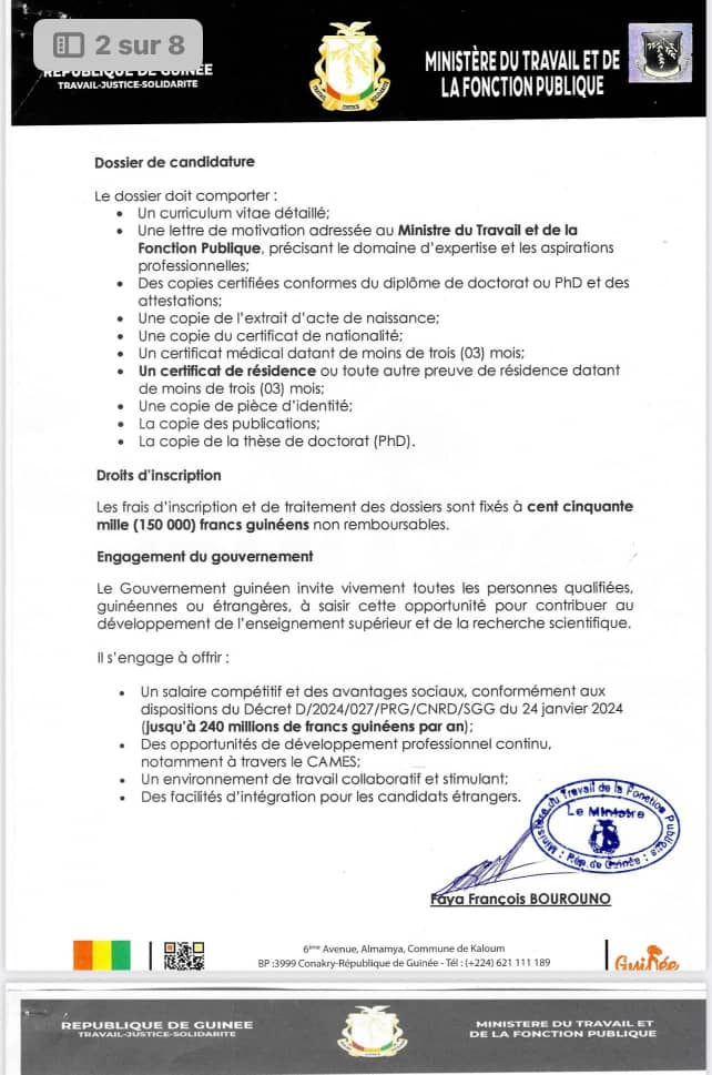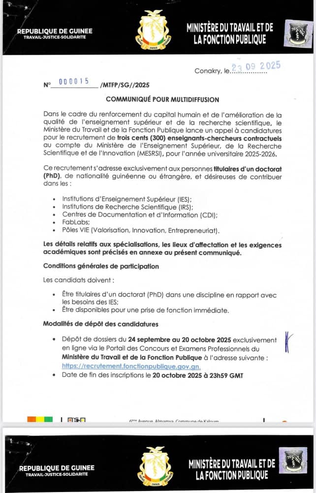 Ce programme de recrutement s’adresse aux détenteurs d’un doctorat (PhD), qu’ils soient de nationalité guinéenne ou étrangère, désireux de contribuer activement au développement des établissements académiques, des centres de recherche et des pôles d’innovation du pays. L’objectif est de renforcer les capacités pédagogiques et scientifiques des institutions, tout en favorisant l’émergence d’une communauté universitaire compétente et tournée vers l’excellence.