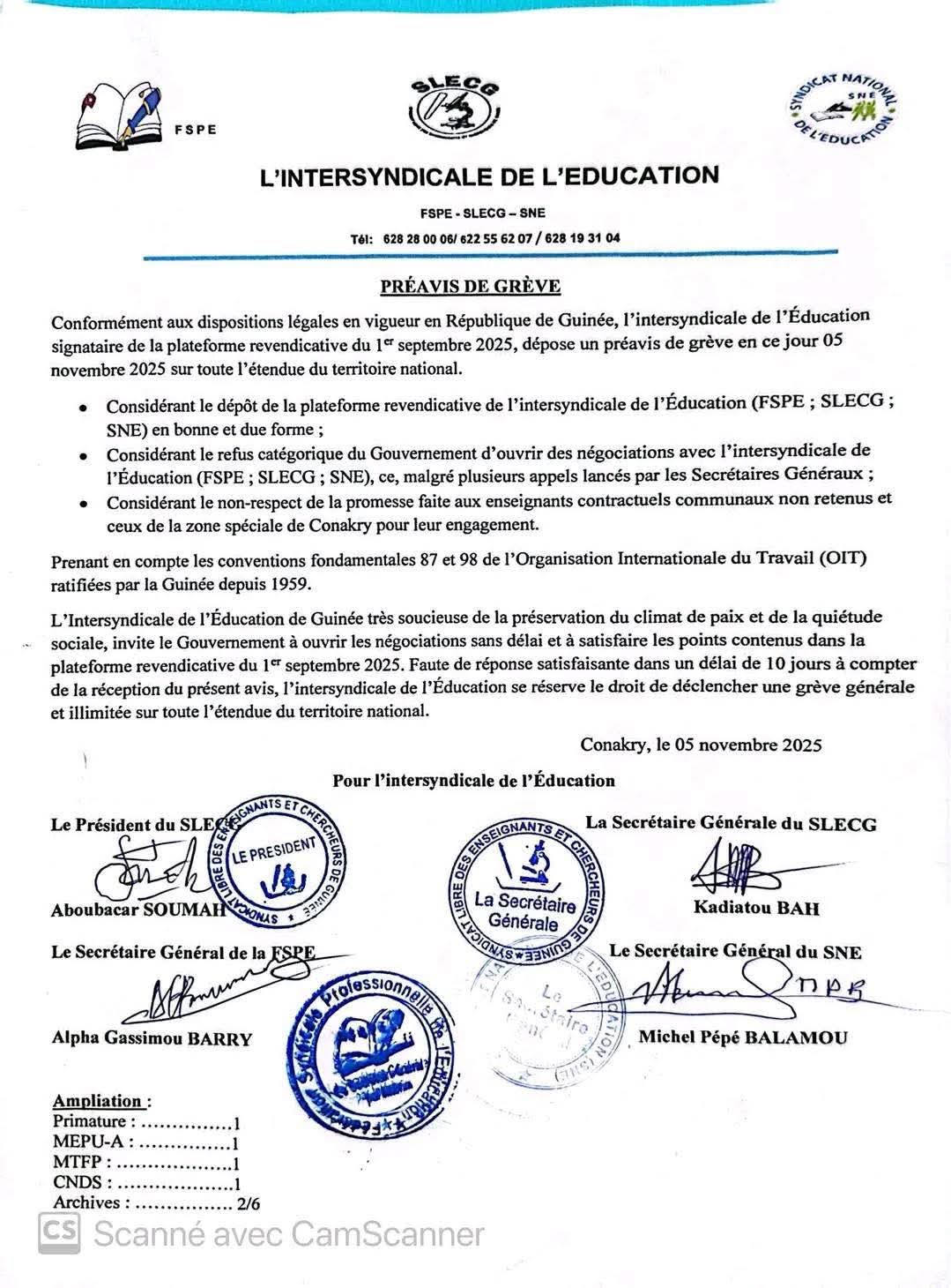 Le climat social risque de se tendre dans le secteur éducatif. Les trois principales organisations syndicales de l’Éducation – la Fédération Syndicale Professionnelle de l’Éducation (FSPE), le Syndicat Libre des Enseignants et Chercheurs de Guinée (SLECG) et le Syndicat National de l’Éducation (SNE) – ont déposé ce mercredi 5 novembre 2025 un préavis de grève auprès des autorités compétentes.
